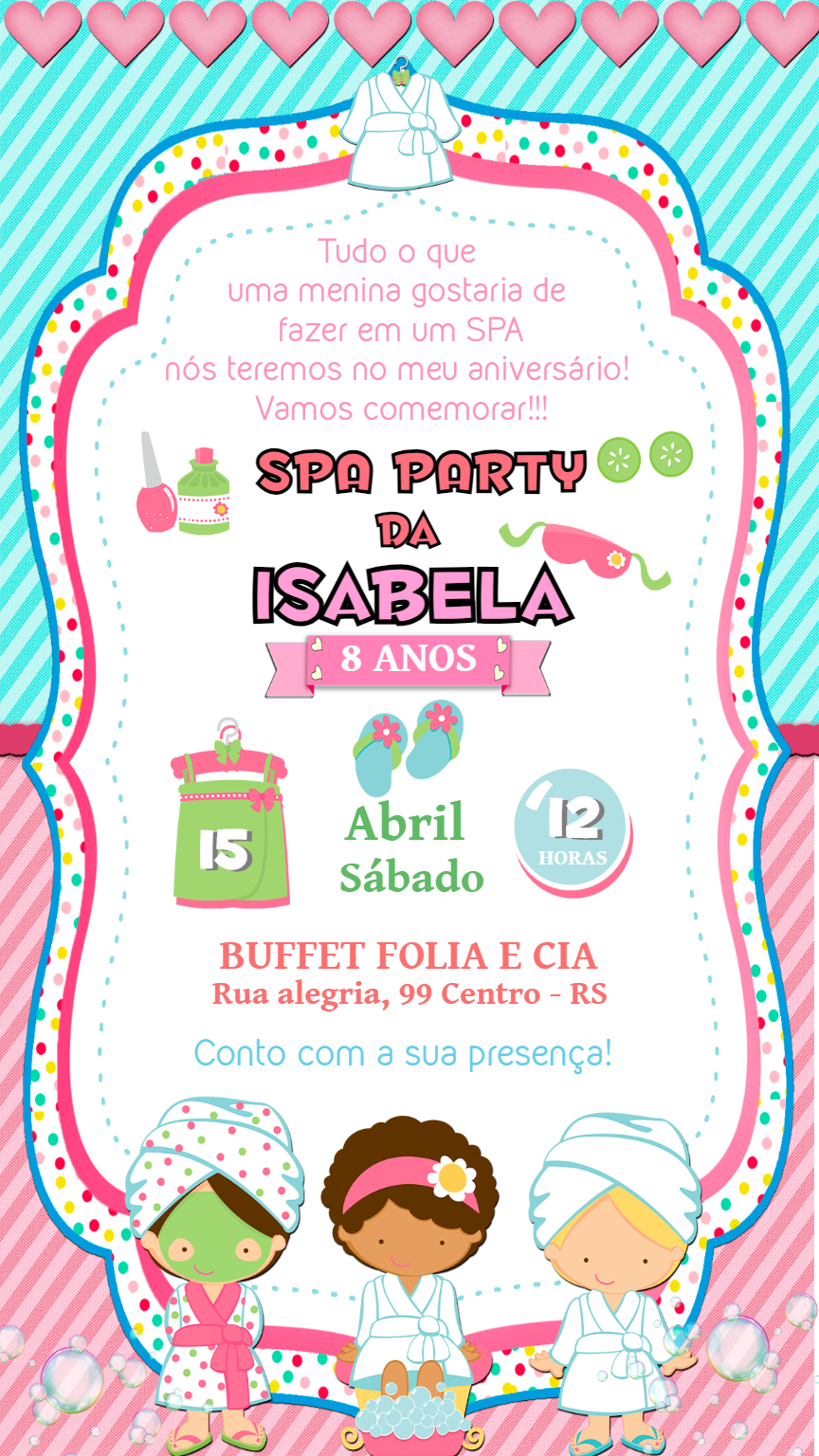Crie um convite de aniversário com tema de spa para meninas. Personalize online com os dados da festa e envie para suas amigas pelas redes sociais!