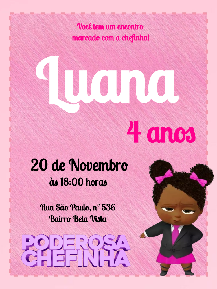 Crie um convite de aniversário personalizado com o tema Poderosa Chefinha Negra. Edite online em minutos e envie para seus convidados pela internet!