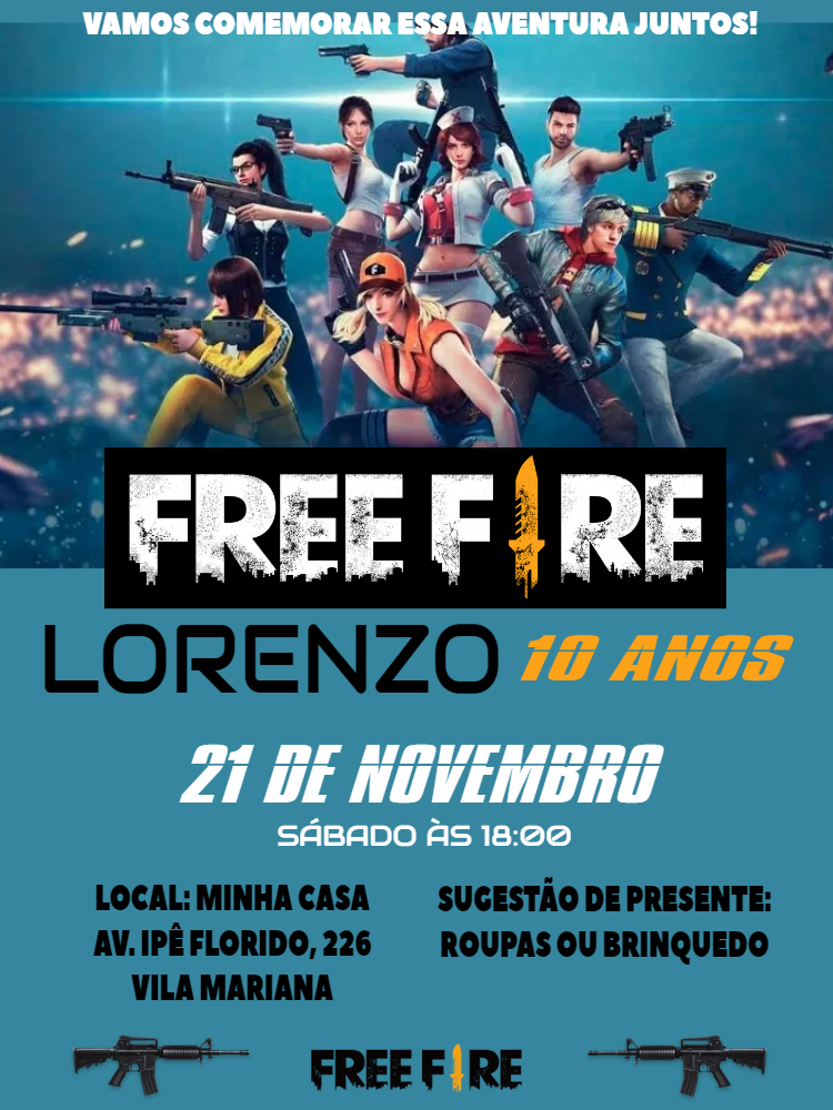 Prepare-se para a batalha! Edite este convite de aniversário do Free Fire facilmente no seu celular ou computador e compartilhe com seus amigos pela internet.