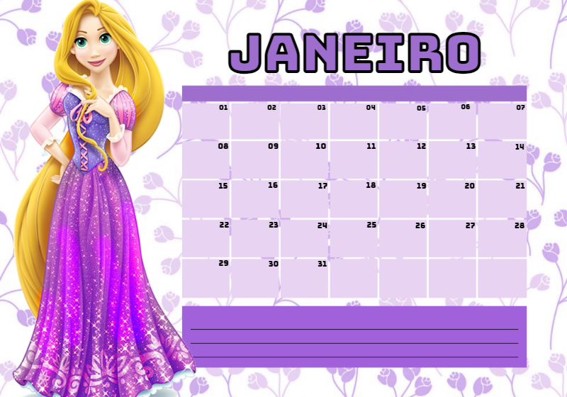 Organize seus dias com a magia da Rapunzel! Edite este lindo planner mensal online de forma fácil e rápida para imprimir ou usar digitalmente.