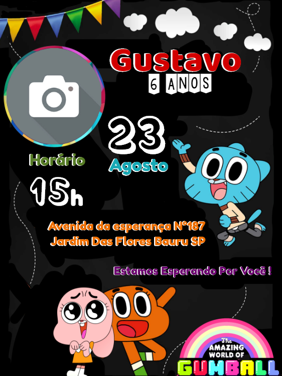 Prepare-se para uma aventura inesquecível com o nosso Convite de Aniversário Digital Personalizado do O Incrível Mundo de Gumball, perfeito para celebrar os 6 anos do Gustavo ou qualquer criança que ama essa turma divertida! Este template vibrante e cheio de energia transmite um sentimento de pura alegria e festividade, ideal para uma festa infantil memorável, onde a diversão é garantida com Gumball, Darwin e Anais. Com um espaço especial para a foto do aniversariante e todos os detalhes essenciais como data (23 de Agosto), horário (15h) e local (Avenida da Esperança N°167, Jardim Das Flores, Bauru SP), você terá um convite exclusivo que fará todos os convidados dizerem "Estamos Esperando Por Você!" com entusiasmo. Este convite com foto é a escolha ideal para convidar de forma criativa e personalizada, garantindo que a celebração do seu pequeno fã de Gumball seja um sucesso absoluto.