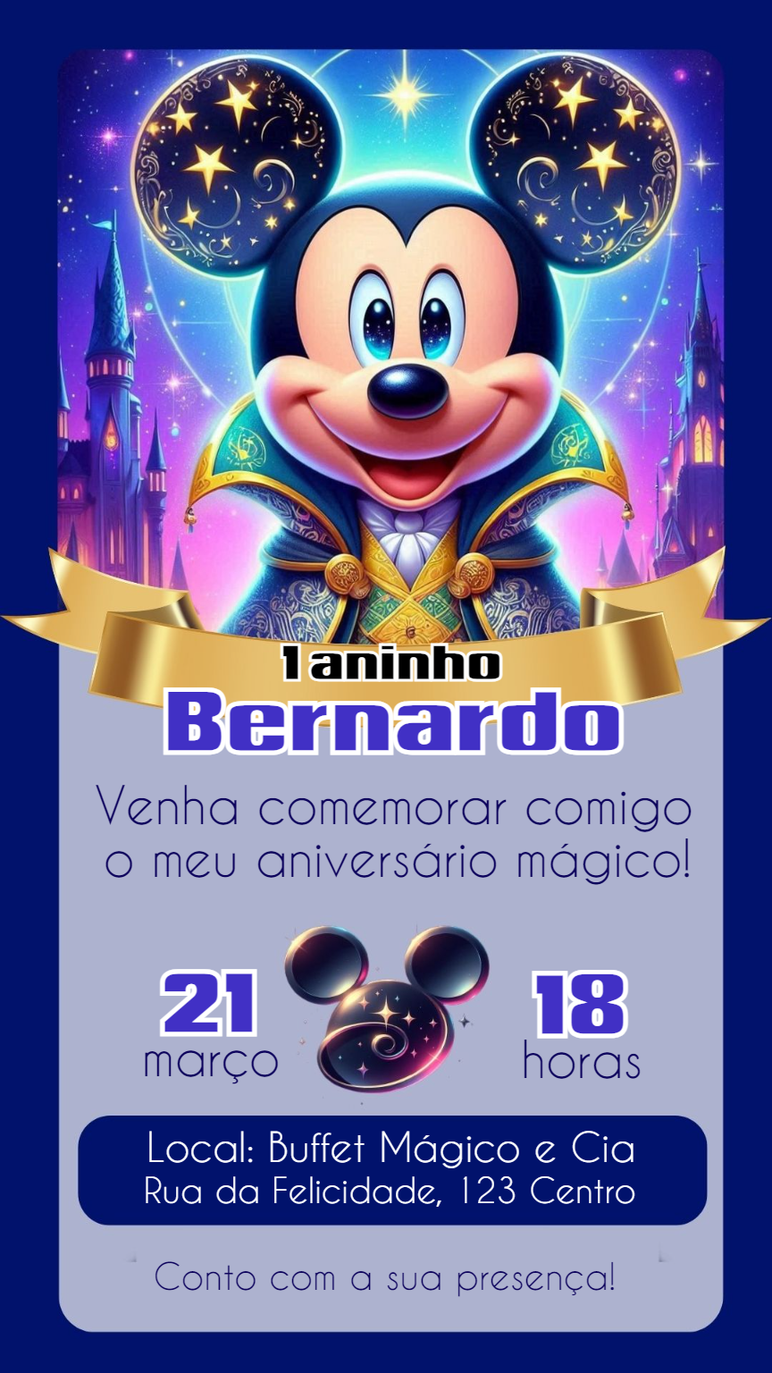 Crie um convite de aniversário encantador com o tema Mickey Mágico! Personalize facilmente com os dados da festa e envie online para seus convidados.