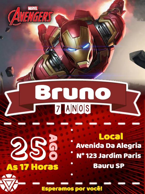 Chame seus amigos para uma aventura heroica com este convite de aniversário do Homem de Ferro! O design vibrante e cheio de ação, com o Vingador em destaque, vai deixar todos no clima para uma festa inesquecível. Personalize você mesmo de forma fácil e rápida! Em nossa plataforma online, você pode editar o nome do aniversariante, a idade, a data, o horário e o endereço da comemoração. Sem complicações! Assim que terminar, é só baixar o arquivo em alta resolução e enviar pela internet ou imprimir. Crie agora o convite perfeito para uma festa de super-herói e surpreenda seus convidados