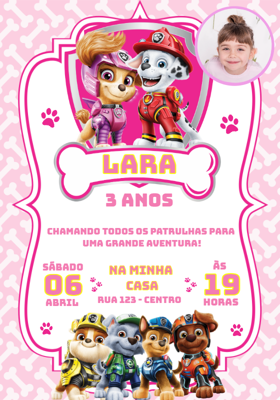 Convite Patrulha Canina Menina com Foto para Editar Online