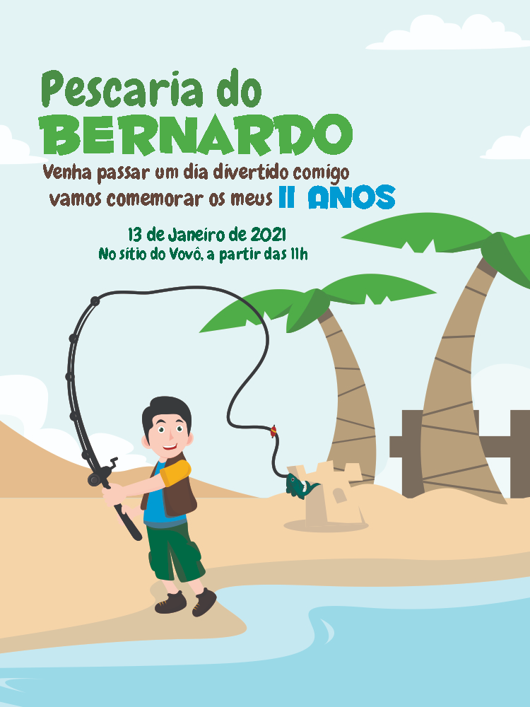 Fisgue seus convidados com este convite de aniversário divertido com tema de pescaria! Ideal para uma festa cheia de aventura, este design encantador com um menino pescador na praia é totalmente personalizável. Edite online de forma simples e rápida: adicione o nome do aniversariante, a idade que ele vai comemorar, e todas as informações da festa, como data, horário e local. Em poucos minutos, seu convite está pronto! Faça o download imediato para compartilhar pela internet com amigos e familiares ou para imprimir em alta qualidade. Crie agora o convite perfeito e prepare-se para uma comemoração inesquecível