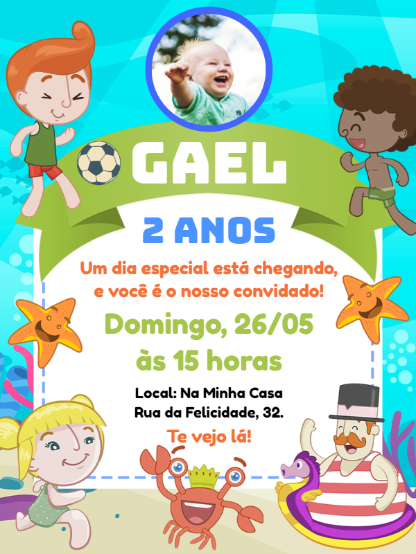 Crie um convite de aniversário personalizado com o tema praia! Adicione a foto do seu filho e edite os dados da festa de forma fácil e rápida.