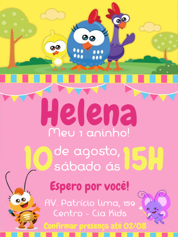 Celebre o primeiro aninho da sua pequena com o nosso encantador **Convite de Aniversário Galinha Pintadinha**, que irradia alegria e diversão em cada detalhe, transportando seus convidados para o universo mágico e colorido dos personagens mais amados pelas crianças. Este template vibrante, ideal para festas infantis e celebrações de **primeiro aninho**, apresenta a Galinha Pintadinha, o Pintinho Amarelinho e toda a turma em um design festivo e lúdico, pronto para ser facilmente personalizado com o nome da criança, data, hora e local da sua festa, como o dia 10 de agosto às 15h na Cia Kids, garantindo uma comunicação clara e encantadora. Perfeito para criar memórias inesquecíveis, este convite, disponível para uso digital ou impressão, otimiza o planejamento da sua festa, adicionando um toque de magia e entusiasmo que fará com que todos os convidados aguardem ansiosamente por este dia tão especial, incentivando a confirmação de presença para garantir a alegria de todos.