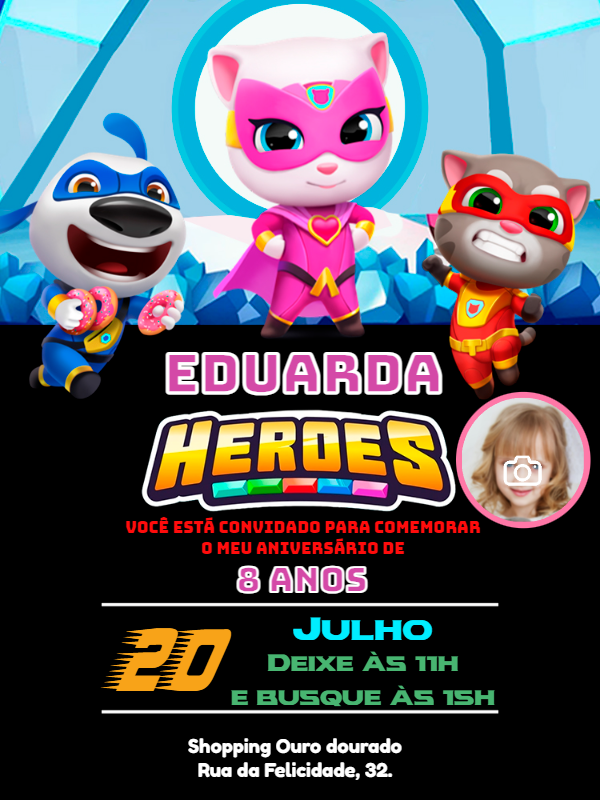 Surpreenda seus convidados com um convite personalizado do Talking Tom Heroes. Edite online, adicione uma foto e envie pela internet para todos!