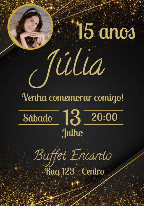 Celebre seus 15 anos com um convite que brilha! Este design elegante em preto e dourado, com detalhes em glitter, é perfeito para uma festa de debutante inesquecível. Adicione sua foto favorita para dar um toque pessoal e único. Edite online de forma rápida e fácil! Personalize com o nome da aniversariante, a data, o horário e o local da festa. Após editar, baixe seu convite instantaneamente e prepare-se para compartilhar. Ideal para enviar online para seus amigos e familiares ou para imprimir em alta qualidade. Crie um convite deslumbrante em minutos e torne sua celebração ainda mais especial
