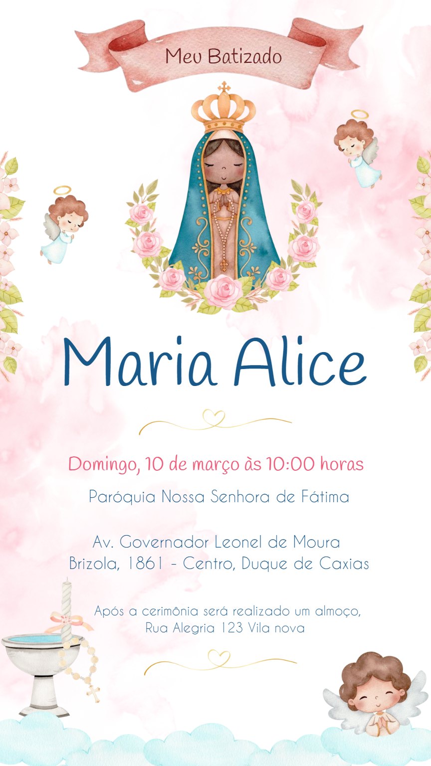Celebre o batizado da sua menina com um convite encantador e cheio de fé. Este design delicado, com uma linda ilustração de Nossa Senhora em aquarela, anjinhos e flores, transmite toda a ternura e a importância deste momento sagrado. Personalize online em minutos! É muito fácil: adicione o nome da criança, a data, o horário e os endereços da cerimônia e da recepção. Após editar, baixe seu convite imediatamente em alta resolução. Perfeito para enviar digitalmente por redes sociais e aplicativos de mensagens, ou para imprimir e entregar em mãos aos seus convidados. Crie uma recordação inesquecível para um dia abençoado