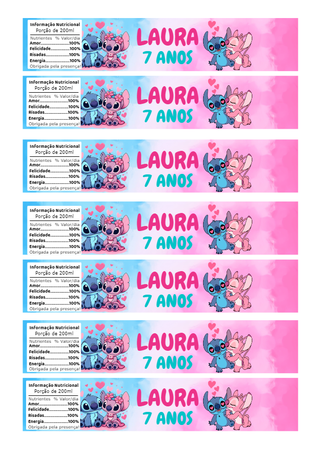 Transforme a sua festa com este encantador rótulo para garrafa de 200ml do Stitch e Angel! Com um design adorável em tons de rosa e azul, ele apresenta o casal mais fofo da galáxia e uma criativa 'Informação Nutricional' de amor, felicidade e energia para surpreender seus convidados. Personalize você mesmo online em poucos cliques: insira o nome e a idade do(a) aniversariante de forma fácil e rápida. Após a edição, o download é imediato! Imprima em casa e crie lembrancinhas únicas para um aniversário inesquecível.