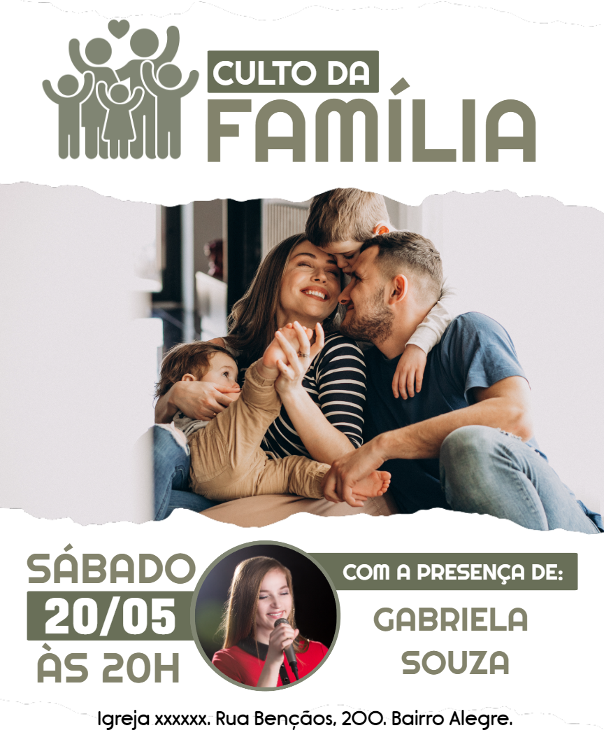 Crie um convite emocionante para o culto da família da sua igreja. Adicione sua foto, altere as informações e compartilhe facilmente pela internet!