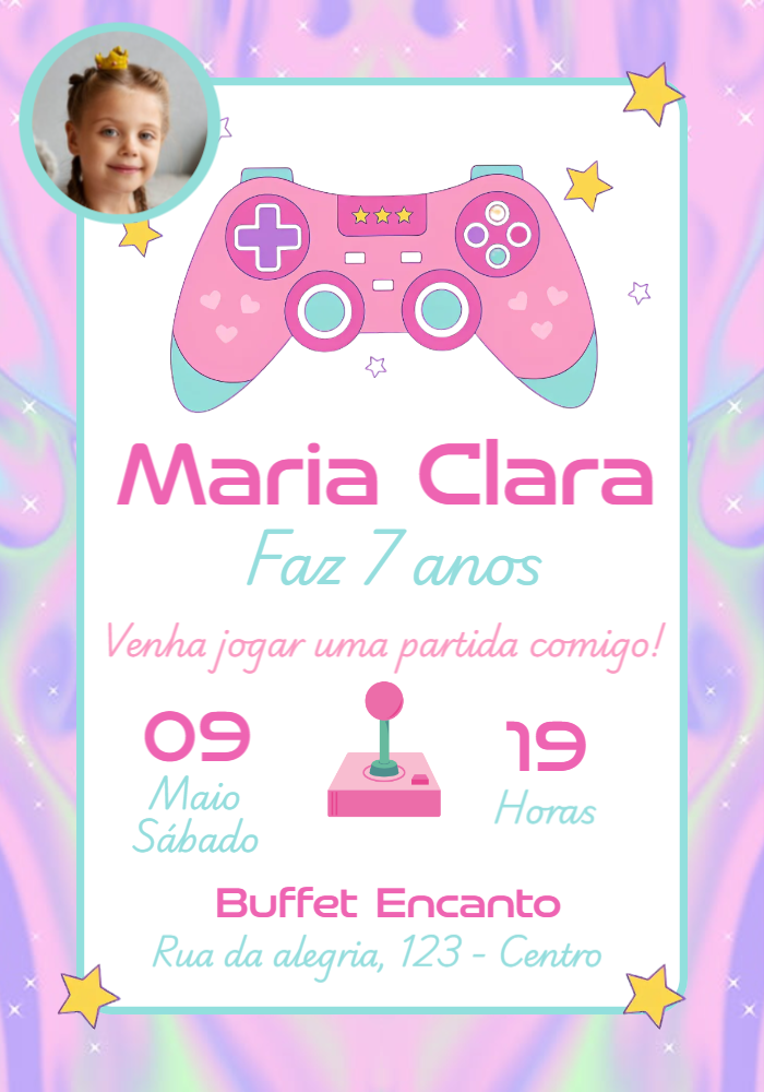 Crie um convite de aniversário gamer feminino super fofo! Personalize com foto, adicione os dados da festa e envie para todos os convidados online.