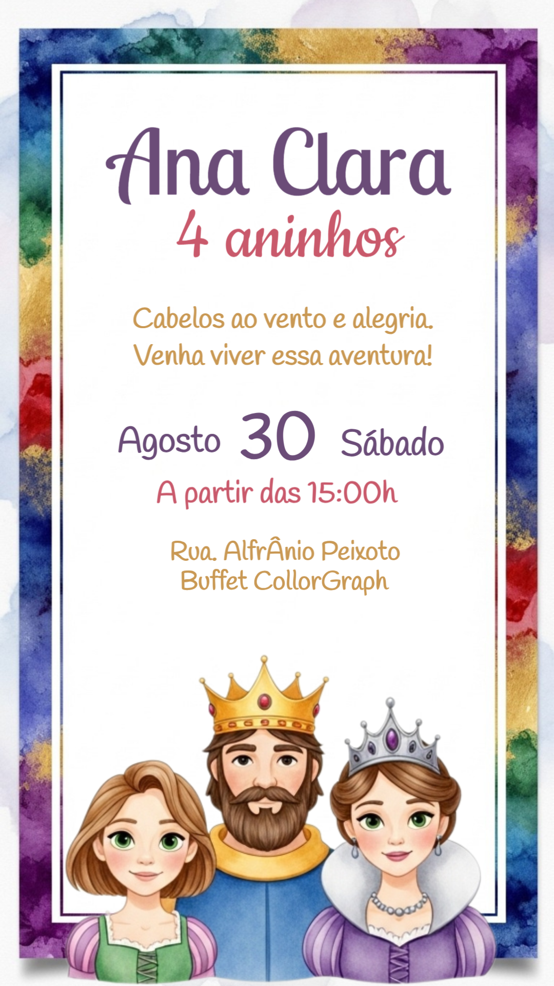 Crie um convite mágico com a princesa Rapunzel e a família real. Personalize online em minutos e compartilhe com todos os seus amigos e familiares.