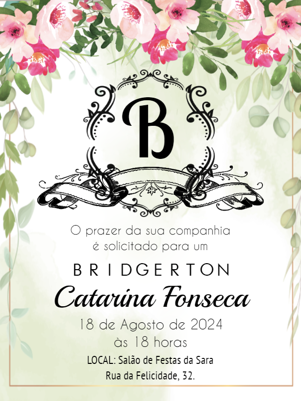 Celebre com a realeza! Personalize este convite floral no estilo Bridgerton de forma rápida e fácil. Ideal para enviar pela internet e encantar a todos.