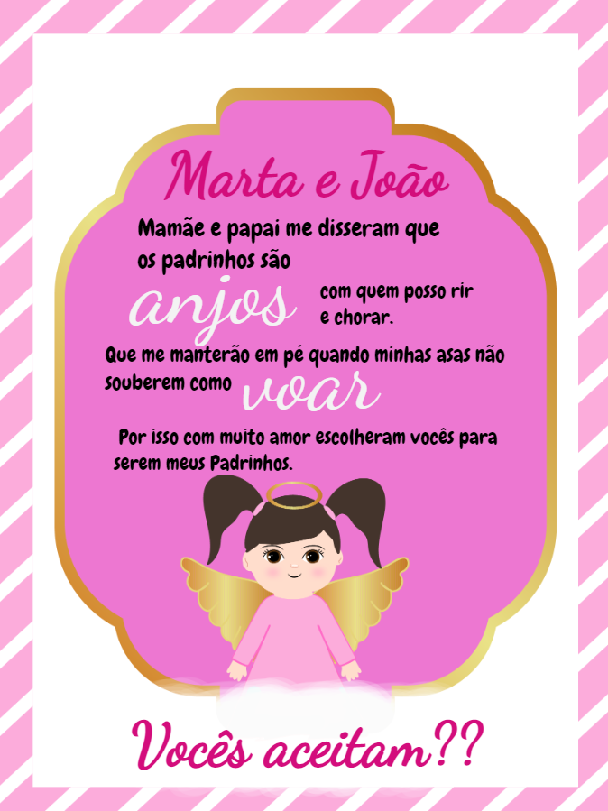 Faça um convite emocionante e inesquecível para os futuros padrinhos com este design delicado de anjinha. Com tons de rosa e uma ilustração encantadora, é a maneira perfeita de fazer o pedido de batismo. Personalize online de forma rápida e intuitiva! Você pode editar facilmente os nomes dos padrinhos e toda a mensagem do convite, deixando-o com um toque único e pessoal. Após a edição, o seu arquivo fica pronto para download imediato. Ideal para enviar pela internet, compartilhar nas redes sociais ou imprimir para entregar em mãos e criar uma linda recordação. Surpreenda quem você ama com um convite especial e cheio de significado. Crie o seu agora mesmo
