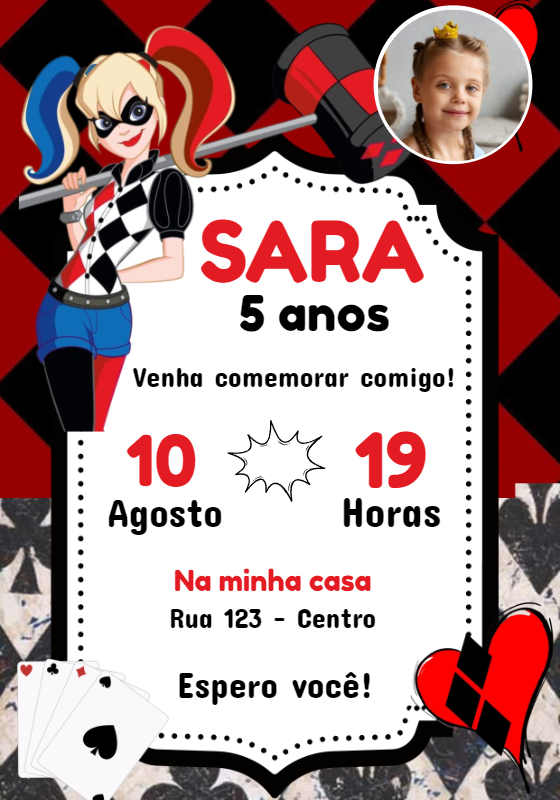 Prepare-se para uma festa cheia de ação com este convite incrível da Alerquina! Com um design vibrante em vermelho e preto, este modelo é perfeito para uma comemoração inesquecível. O grande diferencial é que você pode adicionar uma foto da aniversariante, tornando o convite único e pessoal. Edite online em minutos: personalize o nome, a idade, e todas as informações da festa, como data, hora e local. É super fácil e intuitivo! Assim que terminar, baixe seu convite em alta resolução para imprimir ou compartilhar digitalmente com amigos e familiares. Crie agora mesmo e surpreenda seus convidados com um convite temático e cheio de personalidade