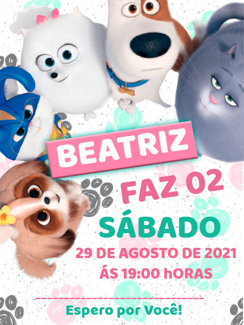 Crie um convite de aniversário inesquecível com os personagens de A Vida Secreta dos Bichos. Edite online de forma fácil e rápida!