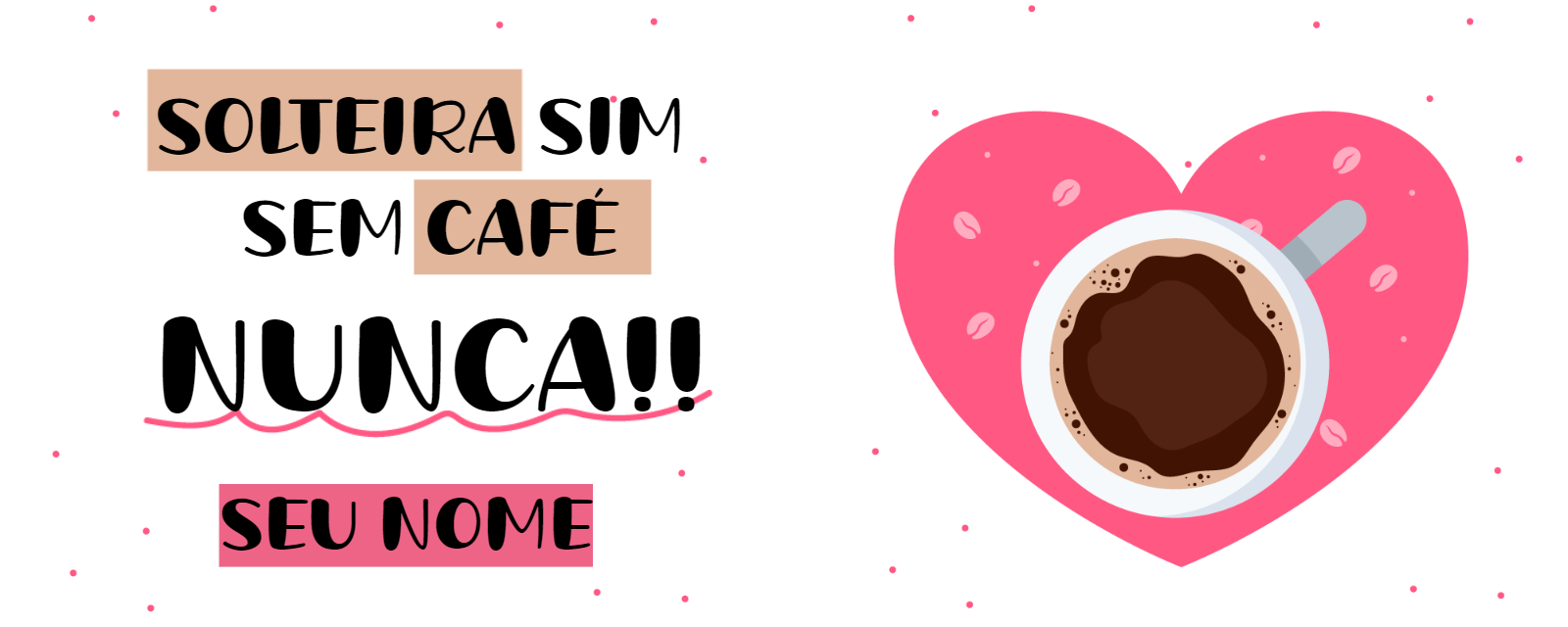 Declare seu amor pelo café com esta arte de caneca divertida e cheia de estilo! Com um design moderno e a frase bem-humorada "Solteira sim, sem café nunca", esta estampa é perfeita para quem não abre mão de uma boa dose de cafeína. A combinação de cores vibrantes, como o rosa, e a ilustração de um coração com uma xícara de café, cria um visual único e charmoso. Personalize online em segundos! Edite facilmente o campo do nome para deixar a caneca com a sua cara. É a escolha perfeita para se presentear, dar de mimo para uma amiga ou para criar produtos para seu negócio. A edição é simples e o download do arquivo é instantâneo. Crie sua caneca exclusiva agora mesmo