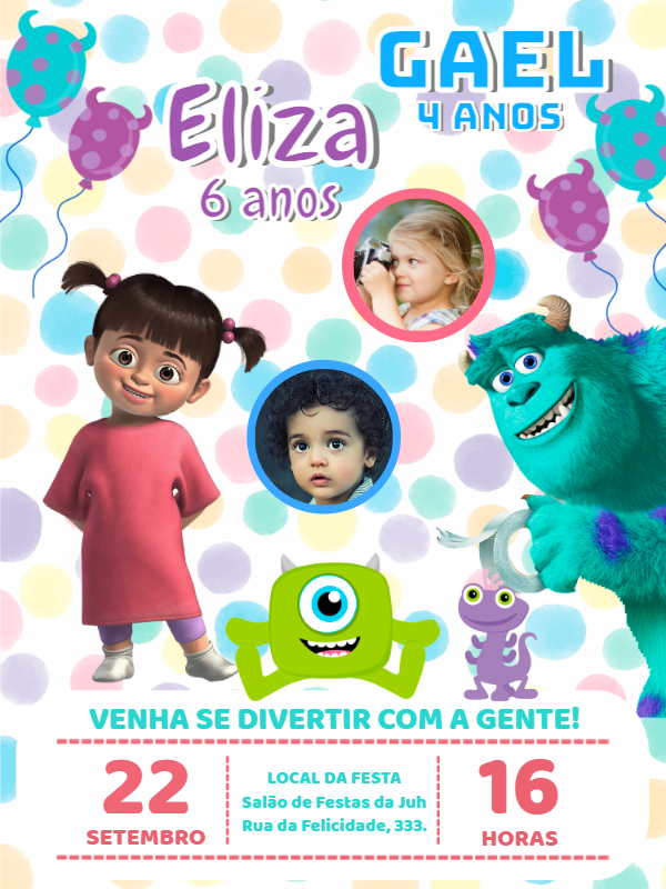 Celebre em dobro! Crie um convite de aniversário com Boo, Sully e Mike. Adicione as fotos dos aniversariantes e personalize online em minutos.