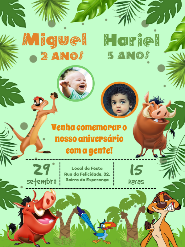 Celebre em dobro com este convite do Rei Leão! Ideal para irmãos, personalize com fotos e edite online de forma rápida e divertida para sua festa.