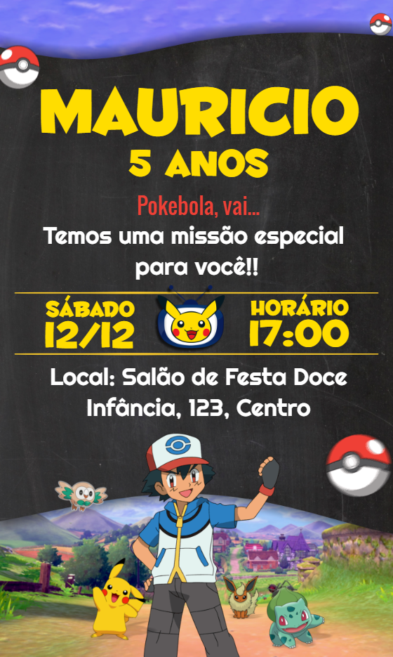 Prepare-se para uma aventura Pokémon! Chame todos os treinadores para a sua celebração com este convite de aniversário vibrante, estrelando Ash, Pikachu e seus amigos. O design divertido com fundo de lousa é perfeito para uma festa inesquecível. Edite online de forma fácil e rápida! Personalize com o nome do aniversariante, idade, e todas as informações do evento, como data, horário e local. Após a edição, o download é instantâneo, pronto para ser enviado digitalmente aos seus convidados ou para imprimir em alta qualidade. Crie um convite único em minutos e dê início à jornada para a festa perfeita