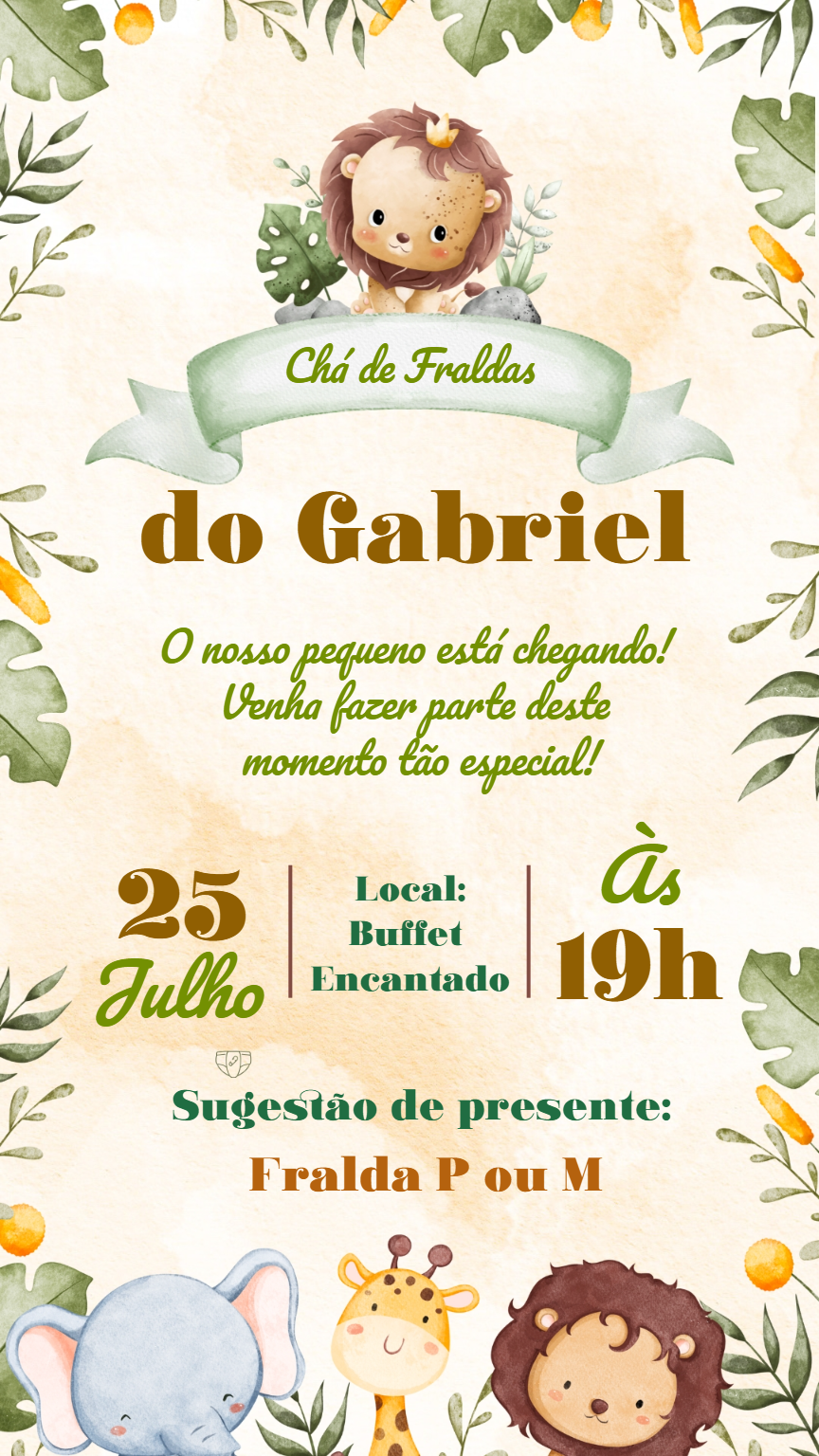 Celebre a chegada do seu bebê com este convite fofo de safari! Edite online com seus dados e envie para todos por WhatsApp ou redes sociais.