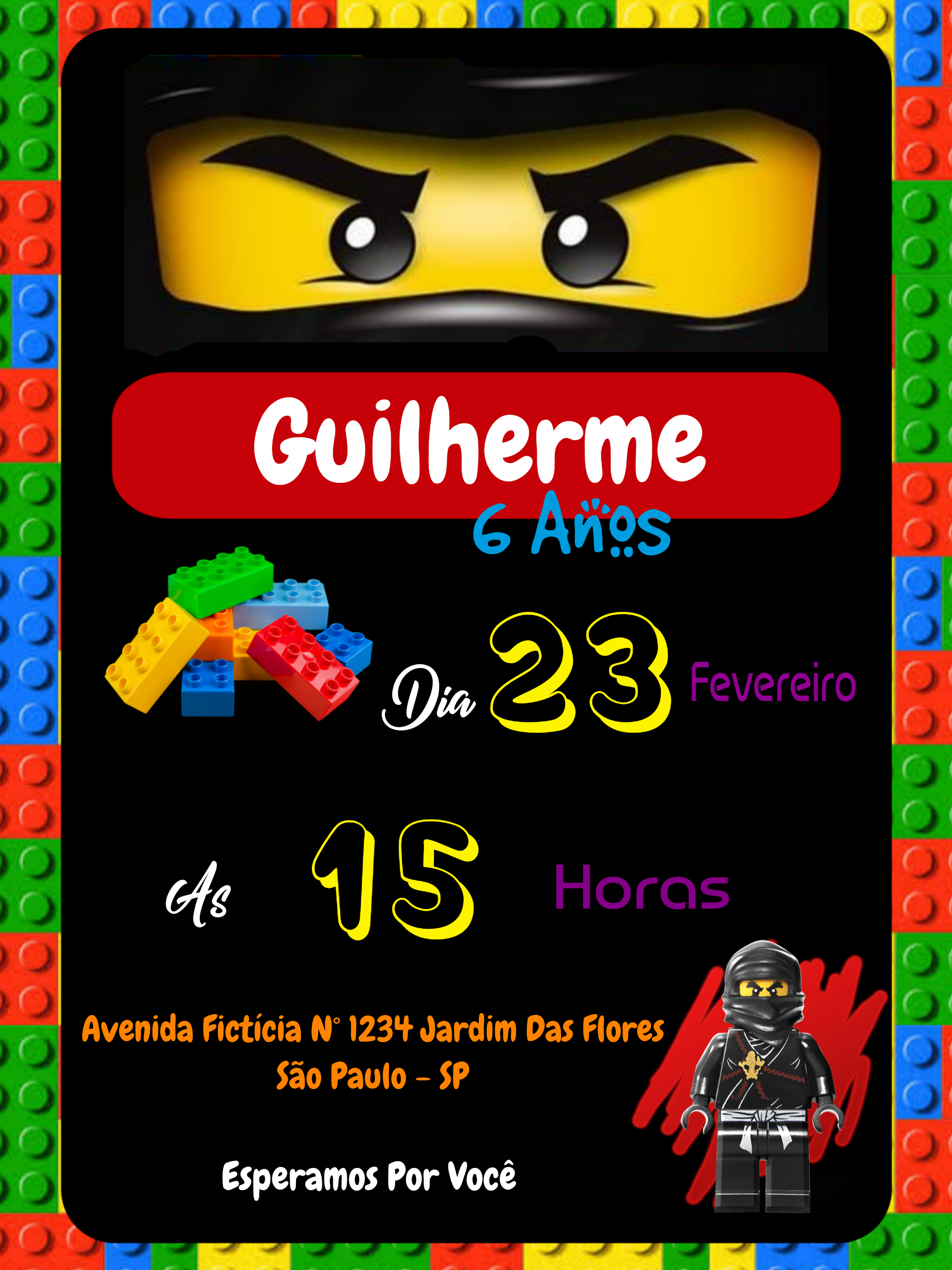 Prepare-se para uma aventura ninja! Este convite de aniversário com tema Lego é perfeito para uma festa cheia de ação e criatividade. Com um design vibrante, com os famosos ninjas e uma borda colorida de blocos de montar, vai encantar todos os convidados. Personalize online de forma fácil e rápida! Adicione o nome do aniversariante, idade, data, horário e o local da sua celebração. Em poucos minutos, seu convite exclusivo estará pronto. Após a edição, o download é imediato, permitindo que você envie pela internet para amigos e familiares ou imprima em alta qualidade. Crie um convite memorável e dê início a uma comemoração inesquecível