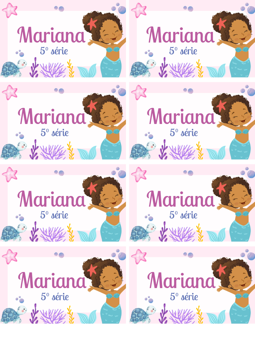 Organize o material escolar com um toque de magia do fundo do mar! Esta linda etiqueta escolar com tema de sereia é perfeita para identificar cadernos, livros e pastas. O design encantador apresenta uma adorável sereia, tartaruga e elementos marinhos em tons de rosa e lilás. Personalize online em minutos! Adicione facilmente o nome e a série da criança para criar etiquetas únicas e cheias de estilo. É super simples e rápido. Após a edição, você faz o download do arquivo na hora para imprimir em casa ou em uma gráfica. Deixe a volta às aulas mais divertida e organizada com este tema que as crianças amam