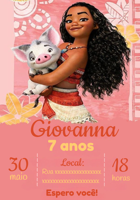 Leve a magia e a aventura de Moana para a sua festa com este convite encantador! A arte traz a corajosa Moana e seu amigo Pua em um cenário tropical com tons de rosa e laranja, perfeito para uma celebração inesquecível. Personalize online de forma fácil e rápida! Altere o nome da aniversariante, a idade, a data, o horário e o local da festa diretamente no nosso site. Em poucos minutos, seu convite exclusivo está pronto. Após a edição, o download é imediato! Receba seu convite em alta qualidade, ideal para enviar pela internet, compartilhar nas redes sociais ou imprimir. Crie agora e prepare-se para uma comemoração cheia de emoção