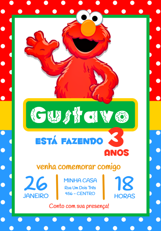 A festa de aniversário com o tema Elmo vai ser inesquecível! Surpreenda seus convidados com este convite digital super colorido e alegre, estrelando o personagem mais querido da criançada. Ideal para uma celebração cheia de diversão! Personalize você mesmo em poucos cliques: edite facilmente o nome do aniversariante, a idade, a data, o horário e o local da comemoração. O processo é rápido e intuitivo! Após a edição, o download é imediato. Você pode enviar o convite online para amigos e familiares ou imprimir em alta qualidade para entregar em mãos. Crie agora e comece a festejar