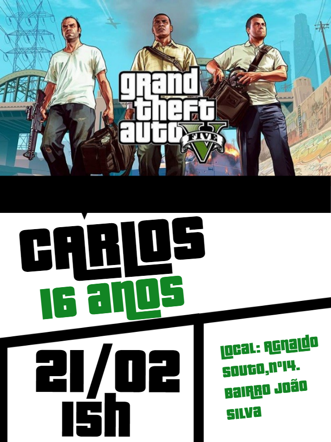 Prepare-se para uma celebração épica e cheia de adrenalina com o nosso Convite de Aniversário GTA V, o template perfeito para transformar a festa de 16 anos do Carlos, ou de qualquer fã de Grand Theft Auto, em um evento inesquecível! Este design vibrante e autêntico captura toda a emoção e o estilo urbano do seu jogo favorito, transmitindo uma atmosfera de aventura, diversão e muita atitude que contagiará seus convidados desde o primeiro olhar. Com a possibilidade de personalizar facilmente todos os detalhes importantes, como nome, idade, data, hora e local, este convite digital é a escolha ideal para uma festa gamer que promete ser lendária, garantindo que todos se sintam dentro do universo de Los Santos antes mesmo de chegarem. Não perca a chance de convidar seus amigos para uma experiência que é puro GTA V, celebrando em grande estilo e com a energia que só esse universo pode oferecer!