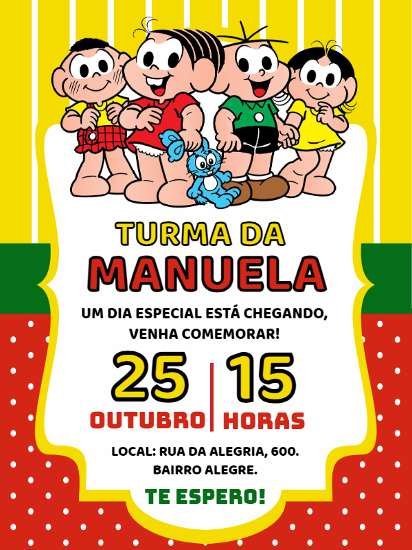 Celebre um aniversário inesquecível com a turminha mais amada do Brasil! Este convite da Turma da Mônica, com seu design alegre e colorido, é a maneira perfeita de chamar os amigos para a festa. Personalize online de forma rápida e intuitiva: insira o nome do(a) aniversariante, a data, o horário e as informações do local. Em instantes, seu convite estará pronto! Faça o download imediato em alta resolução para enviar pela internet ou para imprimir. Crie o seu convite personalizado e comece a comemoração