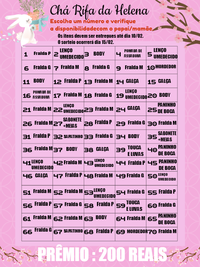 Organize um Chá Rifa encantador com esta arte digital no tema Coelhinha! Com um design delicado em tons de rosa e ilustrações fofas, é a escolha perfeita para celebrar a chegada da sua bebê de forma interativa e divertida. Personalize online em minutos! Altere facilmente o nome da bebê, as instruções, as datas, a lista de itens da rifa e o valor do prêmio. Após a edição, o download é imediato. Use sua arte finalizada para compartilhar nas redes sociais, enviar digitalmente para amigos e familiares ou até mesmo para imprimir. Crie sua rifa de forma prática e charmosa, garantindo todos os mimos para o enxoval