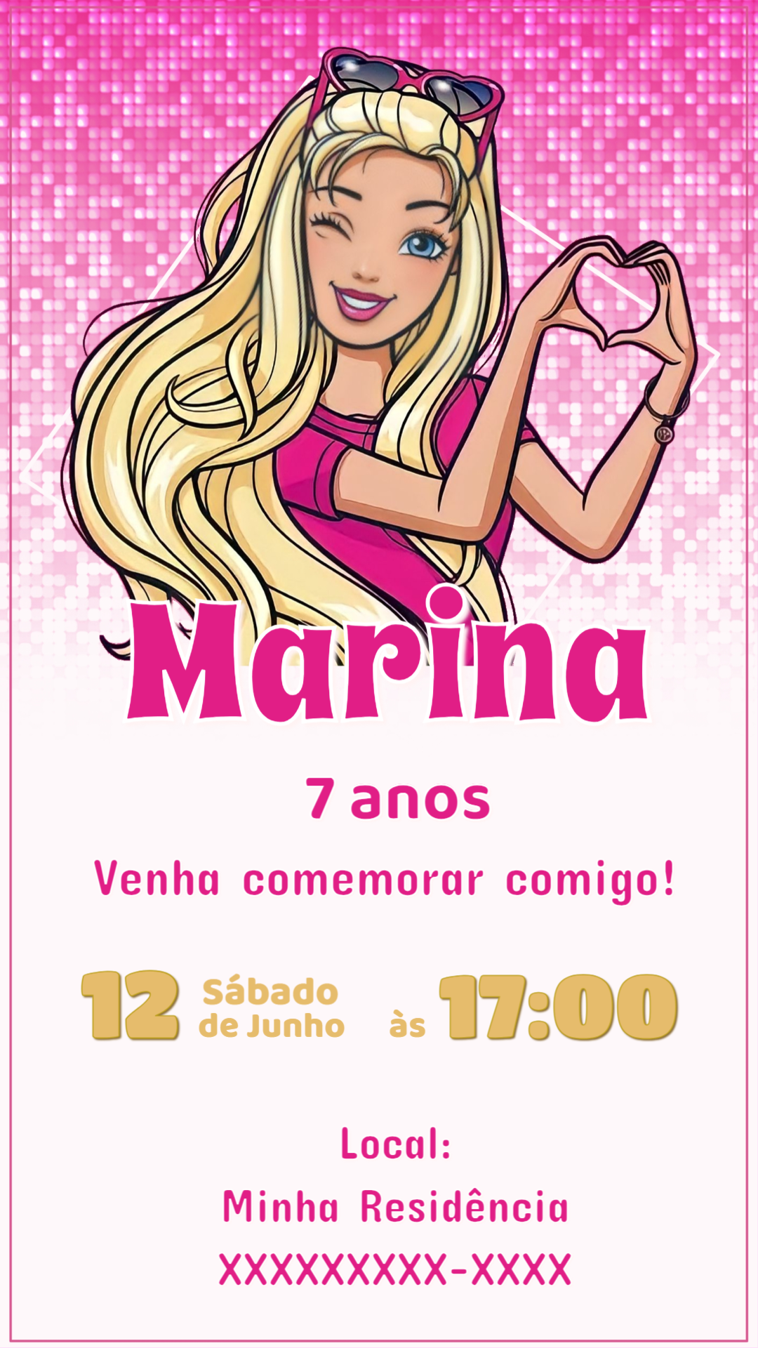 Crie um convite da Barbie personalizado em minutos! Edite com os dados da sua festa e envie para os convidados pela internet de forma rápida e fácil.