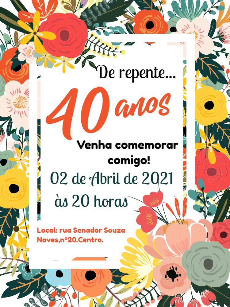 Celebre seus 40 anos com um convite floral elegante. Personalize online em minutos e envie para seus convidados por redes sociais ou WhatsApp.