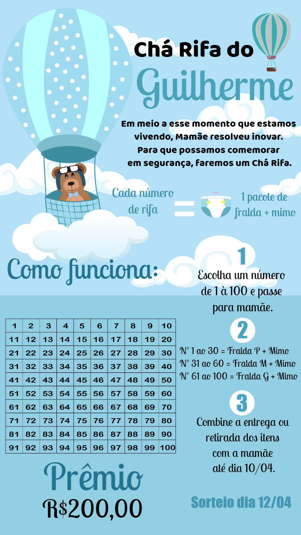 Organize um Chá Rifa inesquecível com este convite digital do Ursinho Baloeiro! Com um design adorável em tons de azul, com um simpático ursinho em seu balão, é a maneira perfeita de celebrar a chegada do seu bebê de forma moderna e segura. Personalize tudo online em poucos cliques! Altere o nome do bebê, as informações da rifa, o prêmio, as datas e todas as regras. A edição é simples e rápida. Após finalizar, o download é imediato! Ideal para compartilhar nas suas redes sociais, enviar por aplicativos de mensagens ou imprimir para um toque mais pessoal. Crie agora e surpreenda seus convidados com este convite criativo e prático
