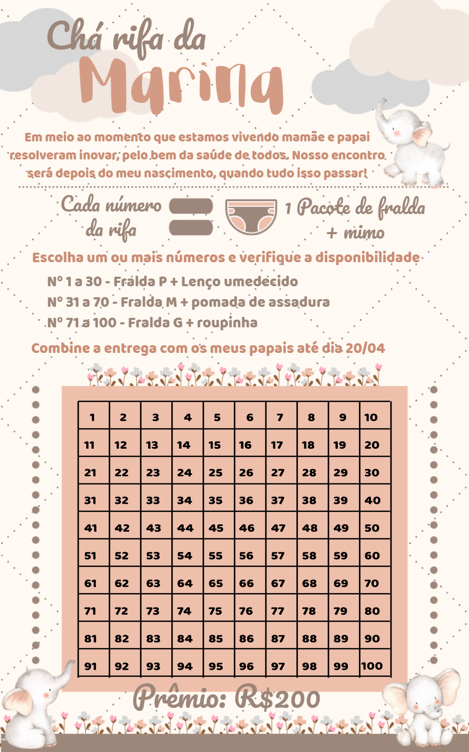 Celebre a chegada da sua pequena com o encantador Convite Chá Rifa Elefantinha, um template digital que exala doçura e carinho, perfeito para um chá de bebê moderno e cheio de amor. Este convite festivo e delicado, adornado com adoráveis elefantinhos em tons suaves e nuvens oníricas, é a solução ideal para organizar um chá rifa prático e seguro, onde amigos e familiares podem contribuir com pacotes de fraldas e mimos essenciais para o bebê, enquanto concorrem a um prêmio especial de R$200. Com a possibilidade de escolher entre diferentes tamanhos de fraldas e produtos complementares, este convite não apenas facilita a organização do seu evento, mas também garante que os futuros pais recebam todo o apoio necessário, transmitindo uma mensagem de cuidado e antecipação pela chegada da Marina, adaptando-se perfeitamente aos novos tempos de celebração.