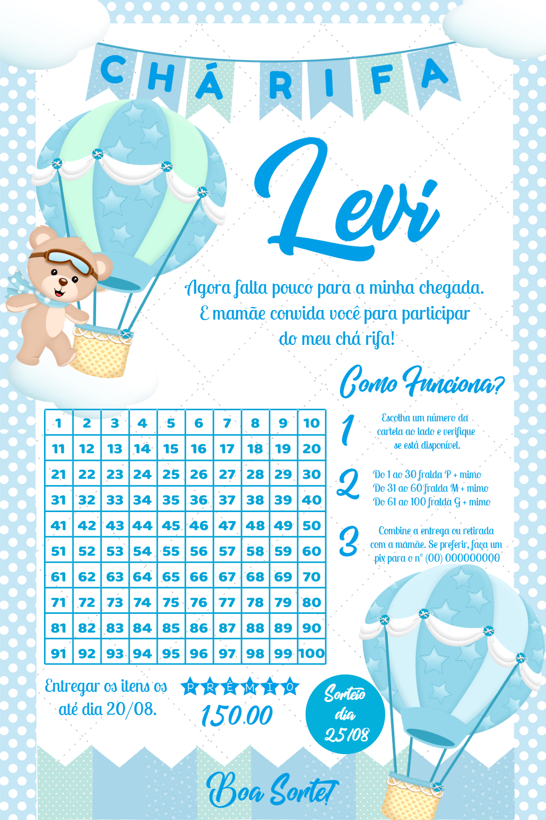 Celebre a chegada do seu bebê com um convite de chá rifa encantador! Este modelo com o tema Ursinho Baloeiro, em delicados tons de azul, é a forma perfeita de convidar amigos e familiares para participar. Personalize tudo de forma simples e rápida diretamente no nosso site: adicione o nome do bebê, altere as instruções da rifa, o valor do prêmio e as datas do sorteio e da entrega. Com a edição online, seu convite fica pronto em instantes. Baixe o arquivo final em alta qualidade para imprimir em casa ou compartilhar digitalmente com seus convidados. Uma solução prática e cheia de charme para o seu evento