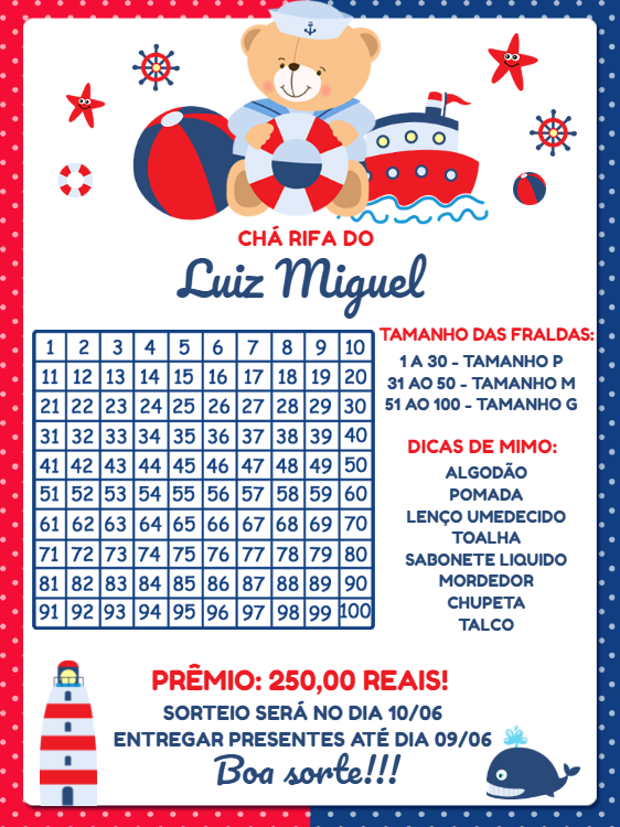 Organize um chá rifa inesquecível com este convite digital do Ursinho Marinheiro! Com um design náutico encantador em tons de azul e vermelho, esta arte é perfeita para celebrar a chegada do seu bebê. Personalize online de forma fácil e rápida: adicione o nome do bebê, as informações da rifa, o valor do prêmio, as datas importantes e as dicas de presentes. É tudo muito simples! Após finalizar a edição, o download é imediato, permitindo que você envie o convite pela internet, compartilhe nas redes sociais ou imprima em alta qualidade. Crie agora e surpreenda seus amigos e familiares com esta linda celebração