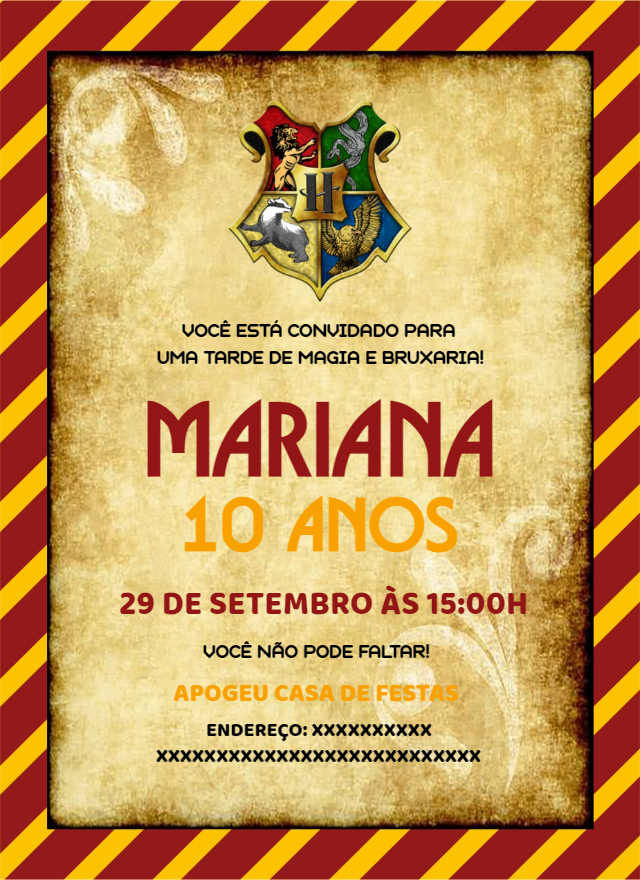 Prepare sua varinha para uma festa inesquecível! Este convite de aniversário com tema Harry Potter é perfeito para celebrar um dia cheio de magia e bruxaria. Com um design de pergaminho envelhecido, o icônico brasão da escola de magia e uma borda com as cores da Grifinória, ele vai encantar todos os seus convidados. Personalize online em minutos! Adicione o nome do(a) aniversariante, a idade, a data, o horário e o endereço da sua celebração mágica. É simples, rápido e você não precisa de nenhuma habilidade especial. Após a edição, baixe seu convite instantaneamente e compartilhe online com amigos e familiares ou imprima para uma entrega especial. Crie agora e comece a contagem regressiva para a sua aventura no mundo bruxo