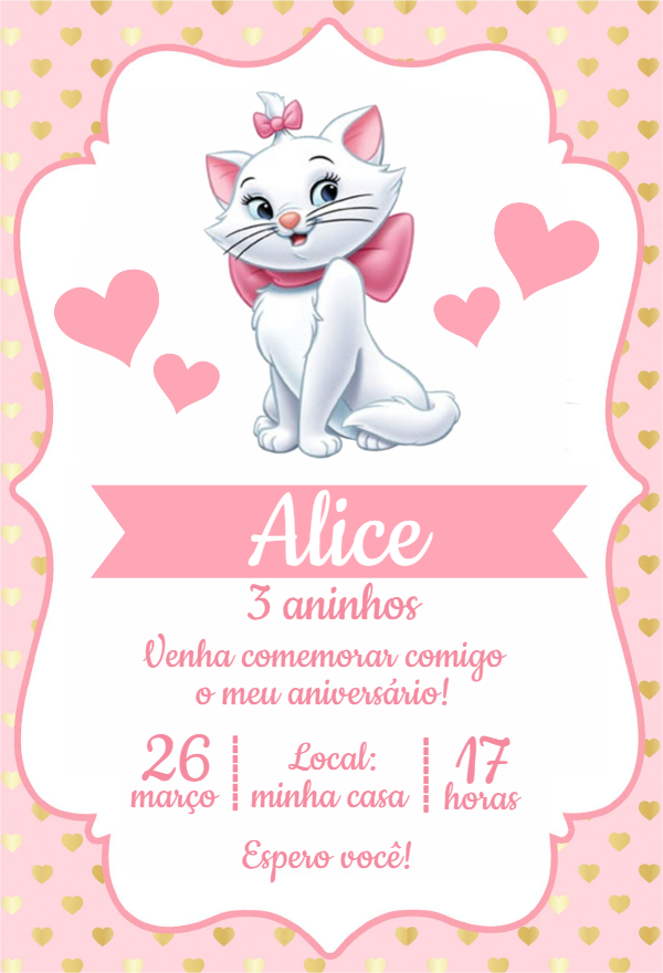 Crie um convite de aniversário encantador com a Gatinha Marie. Personalize online com os dados da festa e envie para todos pela internet!