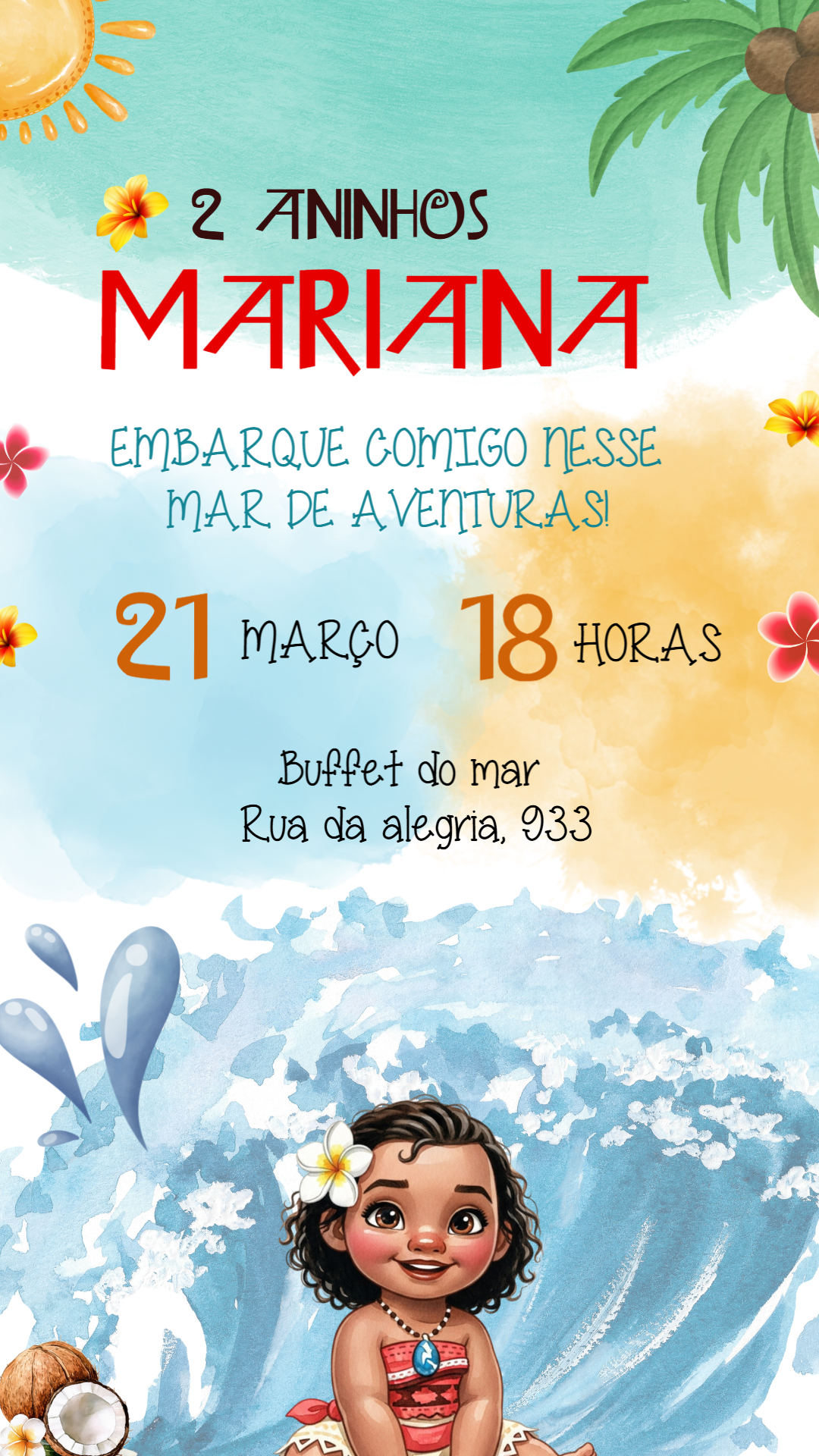 Embarque em uma aventura tropical com este convite de aniversário encantador da Moana Baby! Com um lindo design em aquarela, ondas do mar e a adorável personagem, é o convite perfeito para uma festa cheia de alegria. Personalize você mesmo online em poucos minutos! É super fácil editar o nome da aniversariante, a idade, a data, o horário e o local da celebração. Após a edição, o download é imediato. Crie um convite único e prepare-se para celebrar! Ideal para enviar digitalmente pelas redes sociais ou para imprimir e encantar seus convidados.