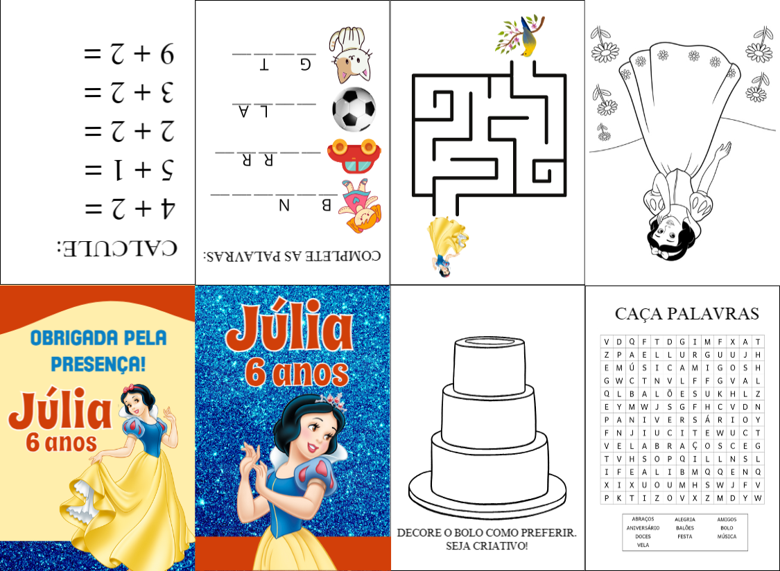 Encante os pequenos com este Mini Livro de Atividades inspirado na doçura e magia da Branca de Neve! Com páginas cheias de diversão e aprendizado, o livrinho traz desafios como labirinto, caça-palavras, continhas, complete as palavras e espaço para colorir. Perfeito para festas com o tema princesas e contos de fadas, este mini livro combina imaginação e entretenimento, sendo uma lembrancinha criativa e educativa para encantar as crianças. ✨ Um toque de magia e alegria para a festa, com atividades que estimulam a criatividade e o raciocínio! 🖨️ Imprima em folha A4 e consulte a aba Ajuda/Tutoriais para mais informações sobre como montar o Mini Livrinho.