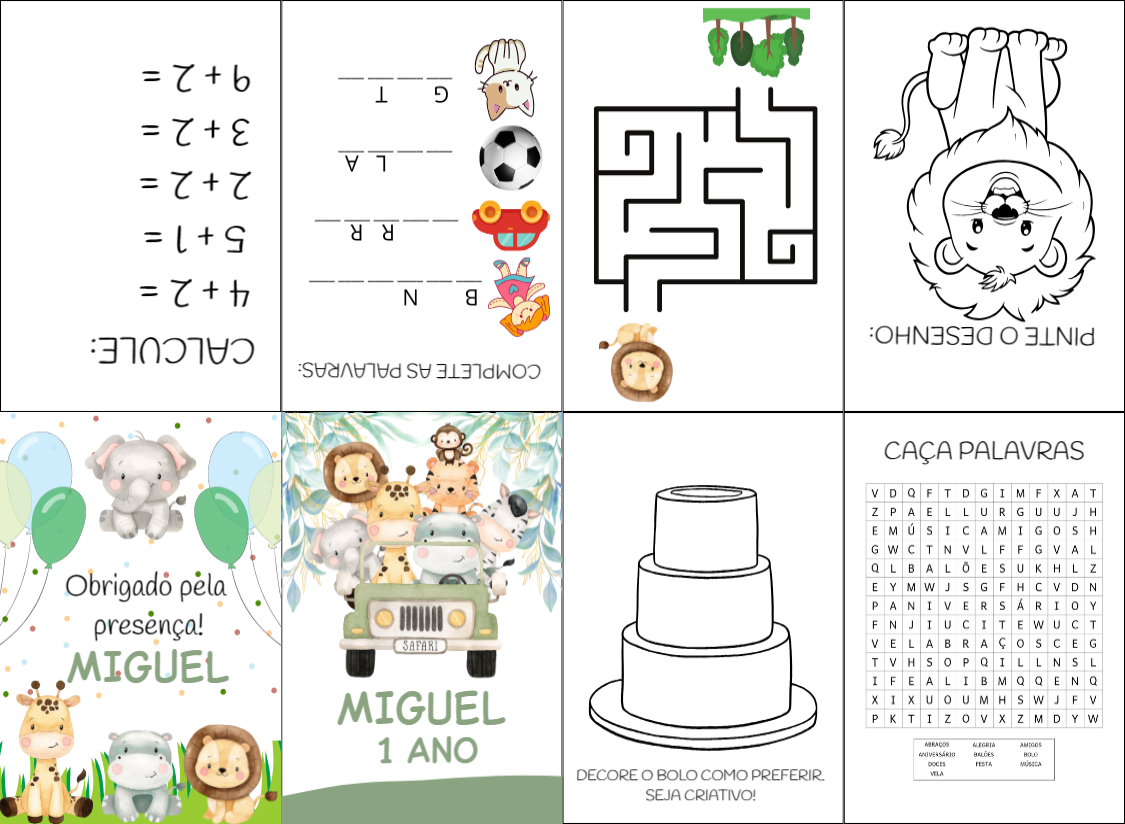 Crie uma lembrancinha inesquecível! Edite online com nome e idade, imprima e divirta as crianças com jogos e desenhos do tema Safari.