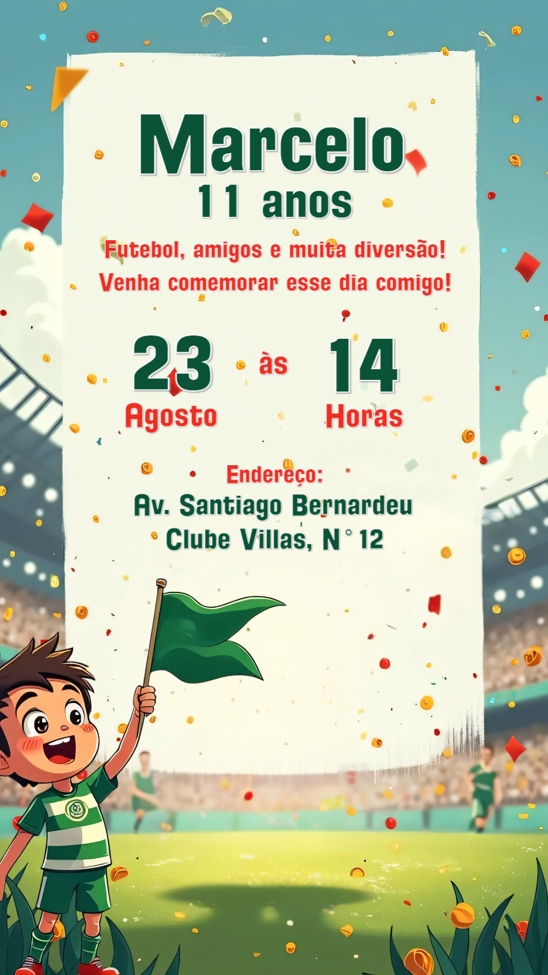 Prepare-se para uma festa campeã com este convite de aniversário com tema de futebol! Com um design vibrante e divertido, mostrando um jovem craque comemorando no estádio, é a escolha perfeita para convidar amigos e familiares para um dia de muita alegria. Personalize online em minutos! Adicione facilmente o nome do aniversariante, a idade, a data, o horário e o local da comemoração. É simples, rápido e o resultado fica incrível. Após a edição, faça o download imediato do seu convite e compartilhe-o digitalmente com seus convidados ou imprima para uma entrega especial. Crie um convite único e marque um golaço na sua celebração