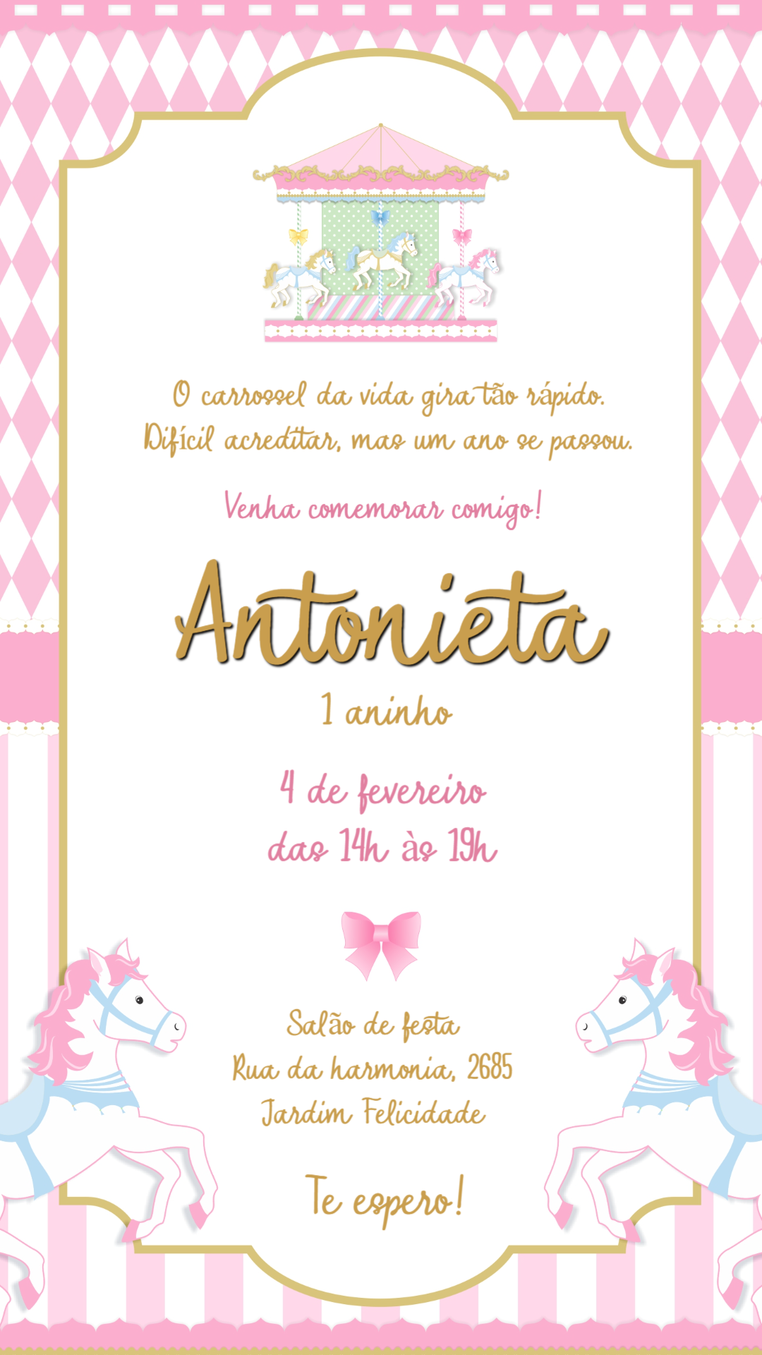 Celebre um momento mágico com este convite de carrossel rosa e dourado. Personalize online com os dados da festa e envie para seus convidados!