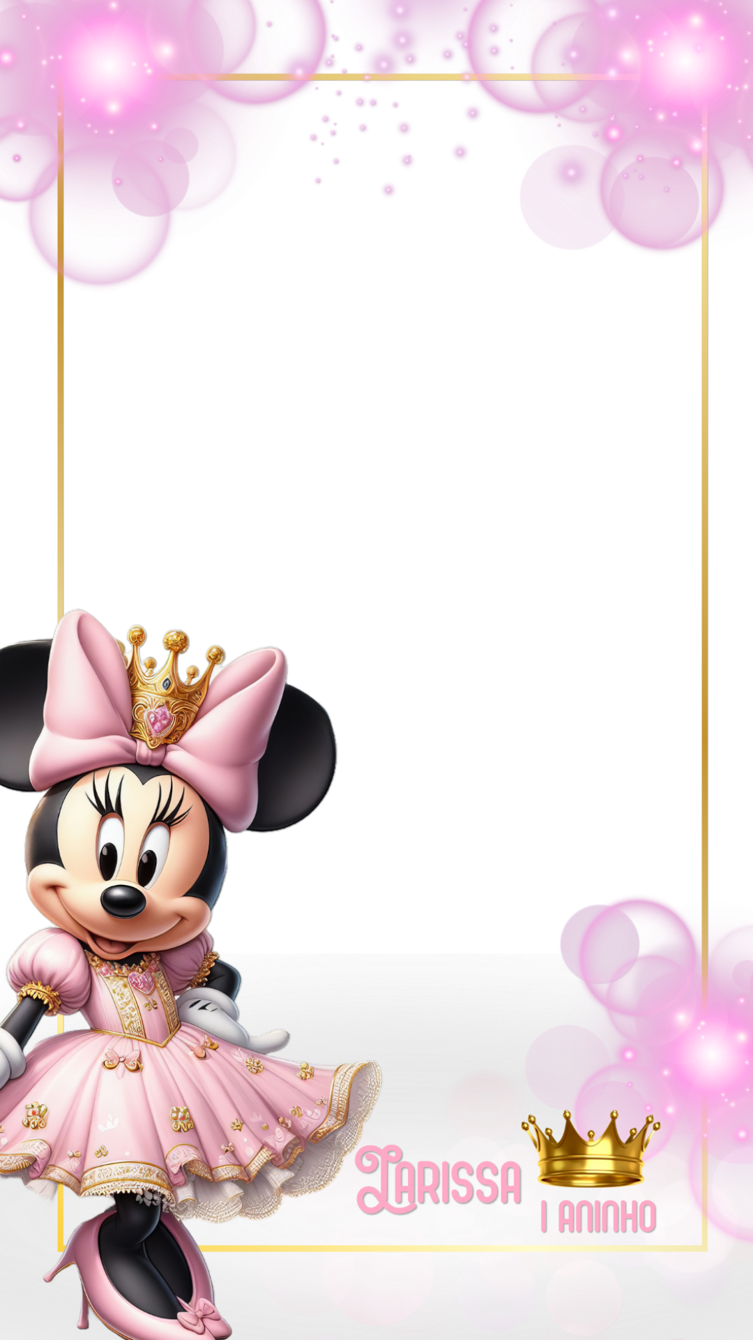 Crie Stories dignos de uma princesa com nossa moldura digital para Stories e filtro Instagram com o tema Minnie Realeza. A imagem apresenta a Minnie Mouse em uma versão de realeza, com seu clássico laço rosa e uma coroa dourada. Ela veste um elegante vestido de princesa em tons de rosa com detalhes e babados dourados, além de sapatos de salto alto também em rosa. A moldura é delimitada por uma linha dourada e decorada com bolhas e luzes em um suave tom de rosa. A arte inclui ainda uma coroa dourada solitária no canto inferior direito, complementando o tema real e delicado. Você pode personalizar online esta moldura, adicionando o nome e a idade da aniversariante em minutos. Crie um conteúdo exclusivo e temático para o seu perfil ou para a festa. Depois de personalizar, é só baixar na hora o arquivo em alta qualidade, pronto para ser usado no seu Instagram. Transforme suas postagens com a magia da Disney e um design real e encantador!