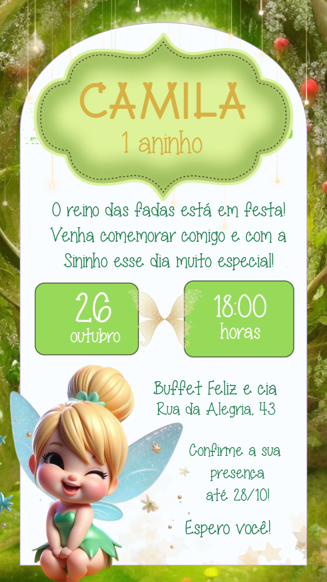 Crie um convite mágico com o tema da fada Sininho. Edite online em minutos, personalize com os dados da festa e envie para seus convidados pela internet!