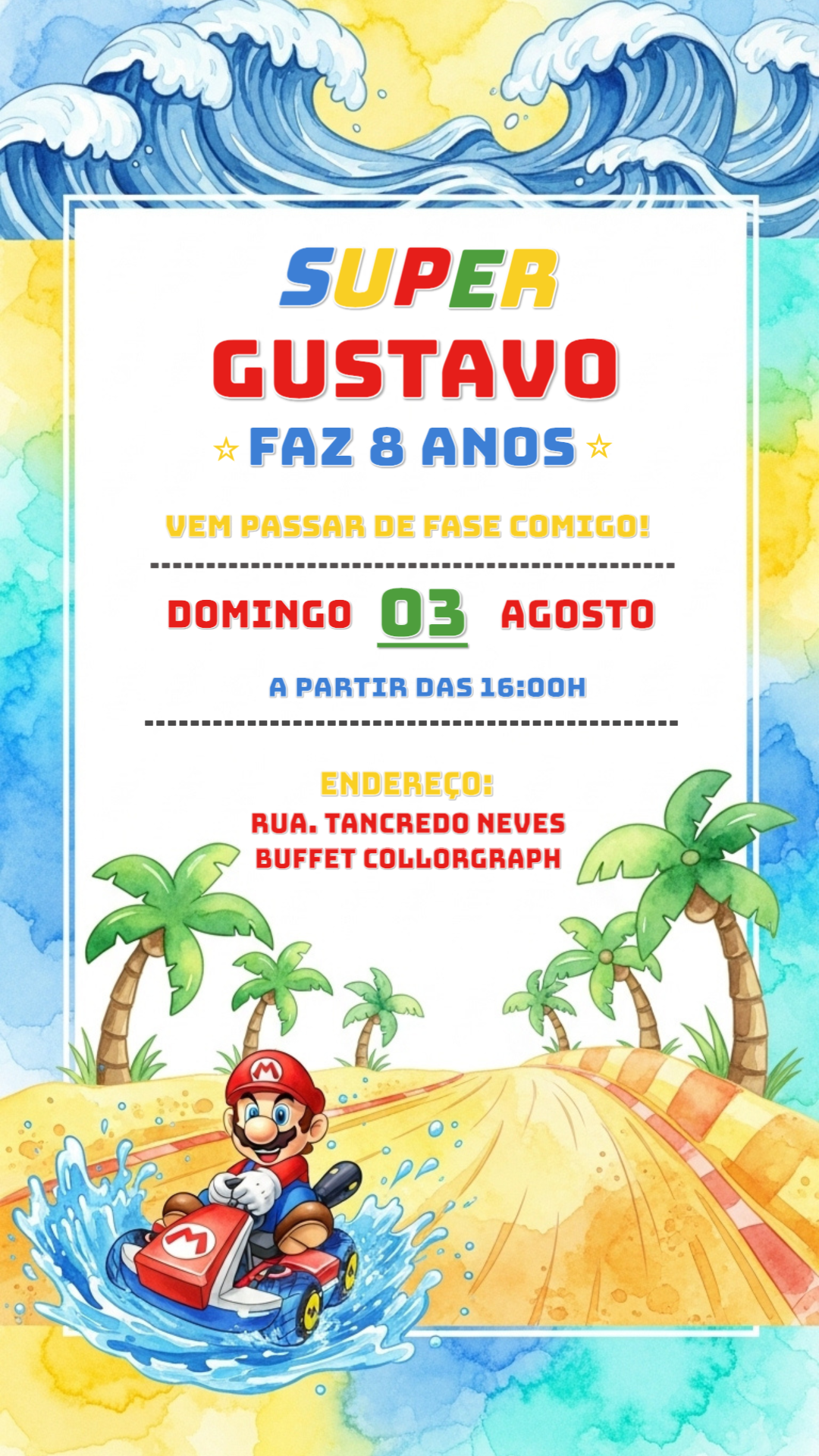 Prepare-se para uma comemoração cheia de aventura com este convite de aniversário temático do Super Mario! Com um design vibrante em aquarela, este convite mostra o Mario acelerando em seu kart por uma pista de praia tropical, perfeito para uma festa inesquecível. Personalize online em poucos minutos! É muito fácil: adicione o nome do aniversariante, a idade que ele irá completar, a data, o horário e o local da sua celebração. Após a edição, o download é instantâneo. Você pode enviar seu convite digital para todos os amigos e familiares pela internet ou, se preferir, imprimir em alta qualidade. Crie agora e acelere para a diversão